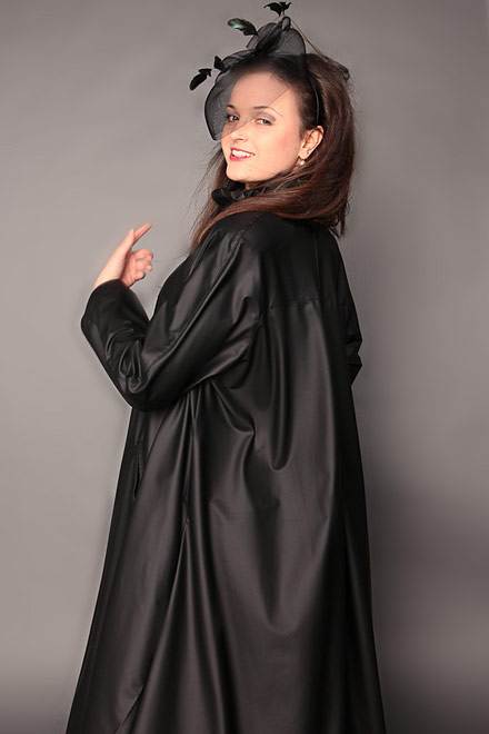Dieser zeitlose Mantel wirkt edel und sportlich zugleich. Unter den Raglanärmeln verstecken sich große Schulterpolster, die eine tolle Silhoutte schaffen. Durch die tiefe Kellerfalte im Rückenteil erhält der Mantel unten eine große, schwingende Weite. Der Mantel hat außerdem zwei Eingrifftaschen. Sein großer Kragen ist versteift gearbeitet und lässt sich mit einer Kordel halsnah zusammenziehen und schön drapieren. Geschlossen wird der Mantel hier mit drei großen Perlmuttknöpfen.