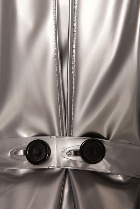 Ein knielanger Regenmantel mit Stehkragen und ein am Rücken mit Knöpfen gehaltener Bindegürtel.